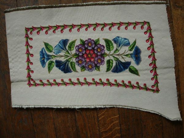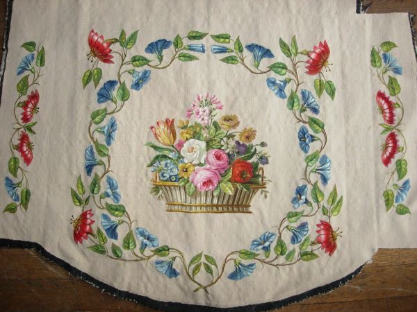 D'un meuble à fond gris en soie à bordure de liserons bleus, orné de bouquet de fleurs dans les dossiers et de rosaces coloriées dans les sièges, commandé pour le grand salon du rez-de-chaussée de l'intendance générale de la Maison du roi établie dans l'hôtel du Châtelet, 127, rue de Grenelle. Composé de deux canapés, deux bergères, douze fauteuils, douze chaises, quatre plants, deux tabourets de pied et un écran, ce meuble fut tissé à Beauvais entre 1829 et 1832.