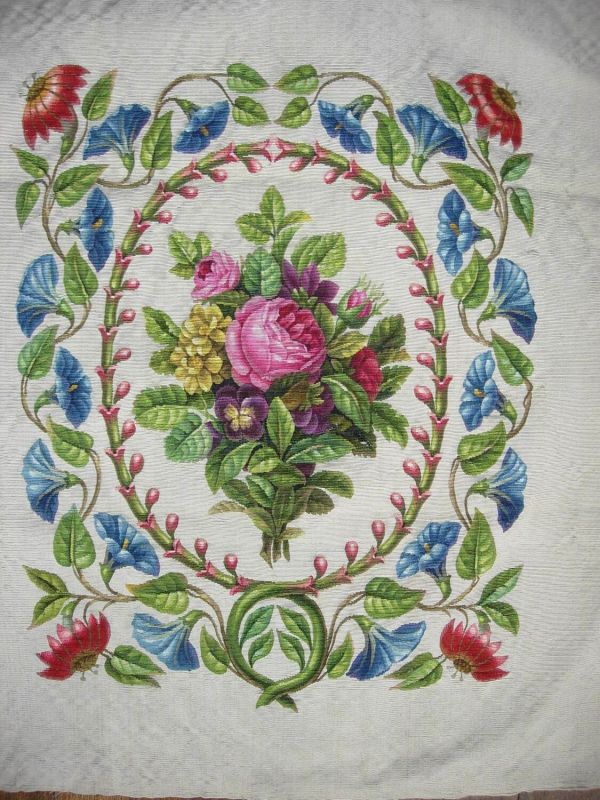 Tapisserie des Gobelins fond jaune bordure lilas. Dessin bouquets et corbeilles de fleurs, rinceaux, rosaces, guirlandes de feuilles et arabesques.