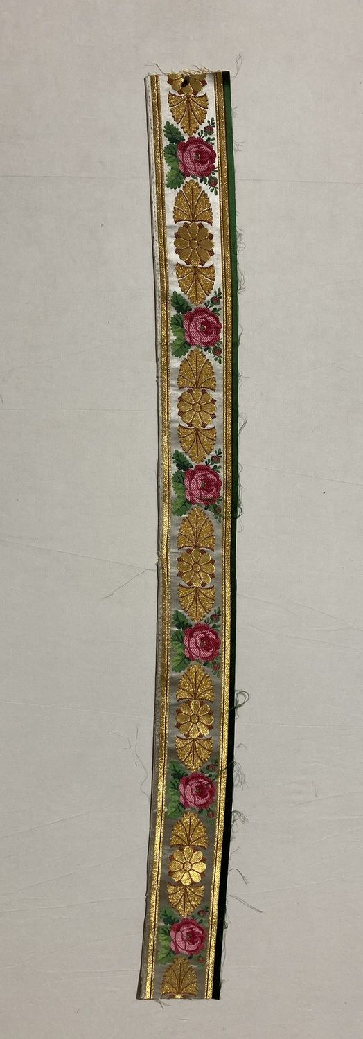 Bordure de siège, en satin fond blanc broché en dorure et soie nuée, dessin à suite de roses, rosaces et ornements.