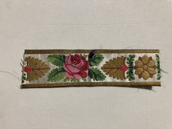 Bordure de siège, en satin fond blanc broché en dorure et soie nuée, dessin à suite de roses, rosaces et ornements.