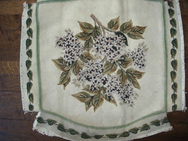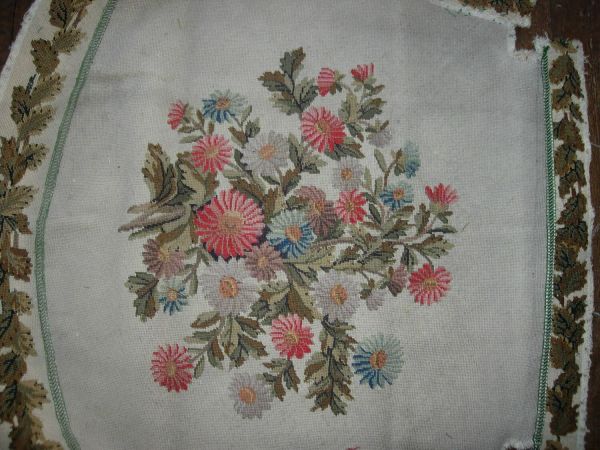 Ensemble de 6 fauteuils en tapisserie au point.( fond, dossier et manchettes), 1 canapé (fond et dossier)
