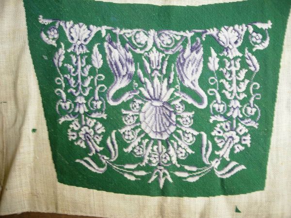 Décor d'arabesques et de feuilles sur fond de laine vert. 2 cygnes au centre.