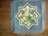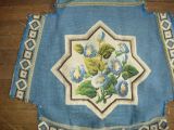 Décor floral sur fond de soie beige. bordure bleue.