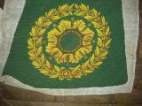 Décor de fleurs et feuilles de laurier. Fleur de lys au centre sur fond laine vert.
