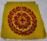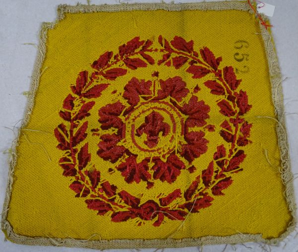 - Dessus de chaise en tapisserie au point, fond jaune, dessin rosaces, couronne de laurier, couleurs jaune et brun.