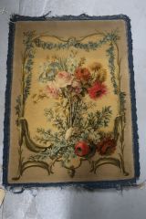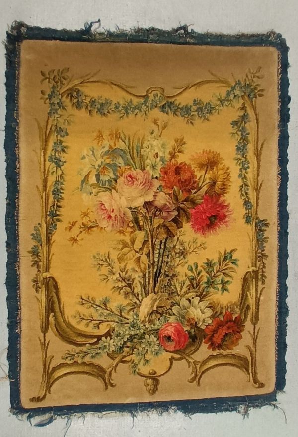 Sur fond beige clair, un rectangle chantourné en beige rosé encadré de branches rocaille or ombré entrelacées d'une guirlande de petites fleurs bleues au sommet et sur les côtés, la base en cartouche, portant un bouquet multicolore et 4 fleurs tombées à la base du bouquet.