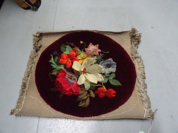 Description récolement : Dessus de siège, motif floral inscrit dans un cercle bordeaux sur fond beige