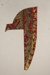 Lampas liseré 2 lats de lancé, broché, fonds satin de 8. Brocart de fonds cramoisi avec motif en arabesques et entrelacs de fleurs et de feuillages selon un effet damassé créé par l'alternance de filé or, frisé or, filé lamé or et bourdon or.