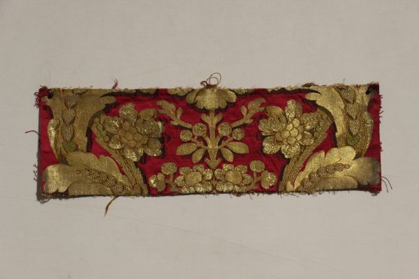 Lampas liseré 2 lats de lancé, broché, fonds satin de 8. Brocart de fonds cramoisi avec motif en arabesques et entrelacs de fleurs et de feuillages selon un effet damassé créé par l'alternance de filé or, frisé or, filé lamé or et bourdon or.