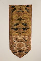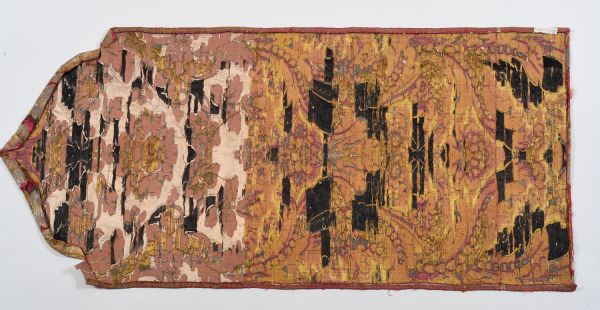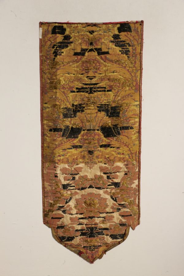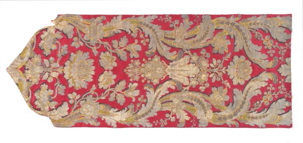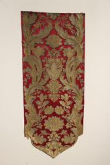 Lampas liseré 2 lats de lancé, broché, fonds satin de 8. Brocart de fonds cramoisi avec motif en arabesques et entrelacs de fleurs et de feuillages selon un effet damassé créé par l'alternance de filé or, frisé or, filé lamé or et bourdon or.