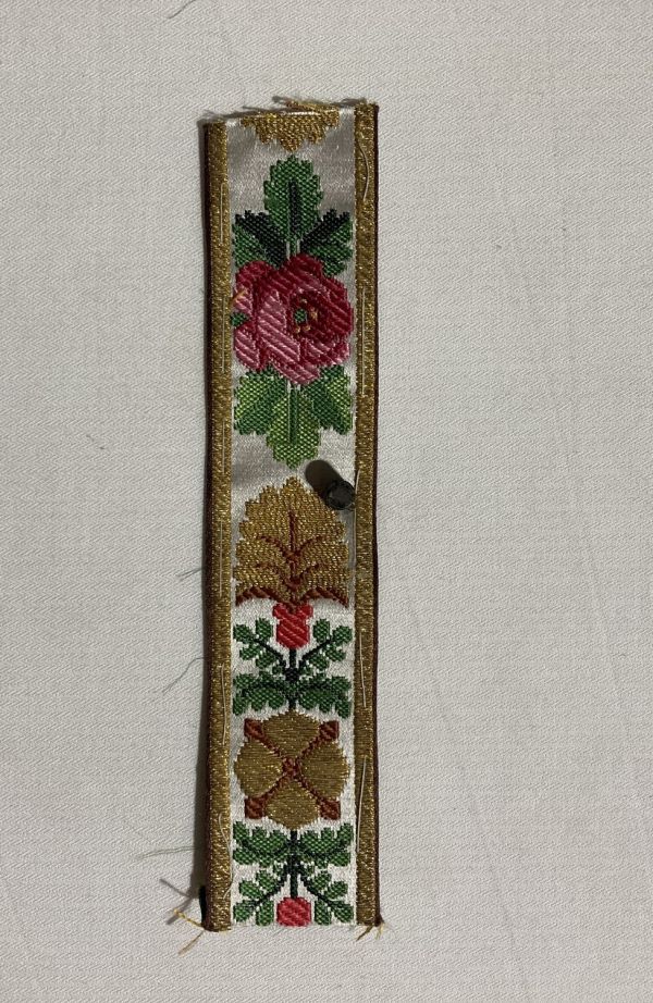 Bordure de siège, en satin fond blanc broché en dorure et soie nuée, dessin à suite de roses, rosaces et ornements.