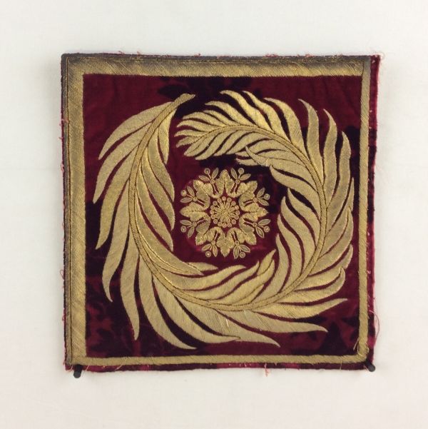 Ecoinçon carré. Les bords inférieur et gauche sont repliés au revers. Présence d'une lisière sur le bord gauche. Velours fond pourpre antique chiné modoré brun, brodé en or relevé (fil or et canetille et petits morceaux de pate dorée).