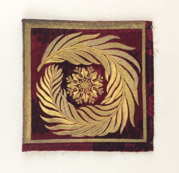 Ecoinçon carré. Les bords inférieur et gauche sont repliés au revers. Présence d'une lisière sur le bord inférieur. Velours fond pourpre antique chiné modoré brun, brodé en or relevé (fil or et canetille et petits morceaux de pate dorée).