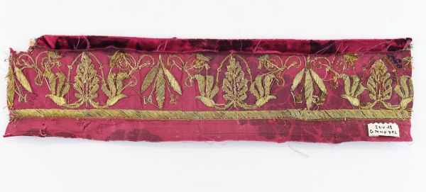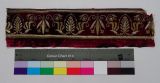 Elément de bordures pour sièges. Section rectangulaire. L'un des bords longitudinaux est replié sur toute sa longueur. Velours fond pourpre chiné mordoré brun, dessin à palmettes brodées en or relevé.