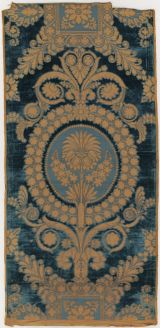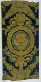 Lé de tenture en velours coupé et réserves en velours frisé et satin bleu clair "pour execution en lames or produisant 2 effets de dorure l'une liez et l'autre sans liage". Le dessin représente "une rosette dans carré" avec feuilles et fleurs, alterné d'un bouquet de fritillaires, fleurettes et feuilles encadré par une couronne de fleurs. Motif s'arrête avant la fin.