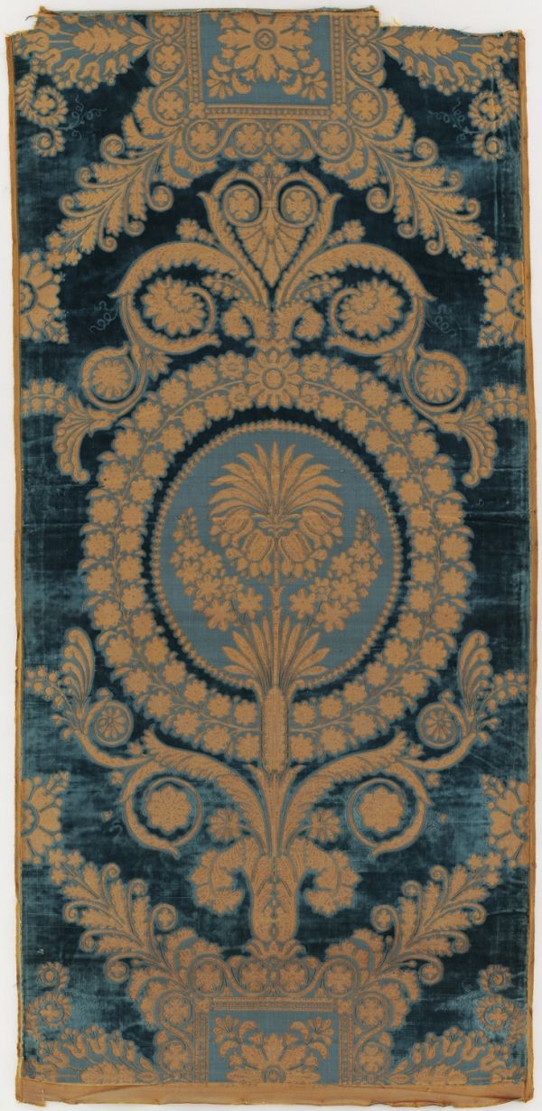 Ce velours lamé ne fut jamais utilisé sous l'Empire ; ce n'est que pour le Sacre de Charles X à Reims le 25 mai 1825, q'uon en employa des métrages pour le Cabinet du Roi au Palais archiépiscopal.