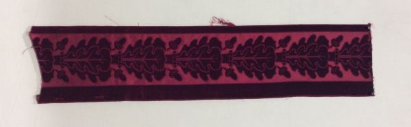 Elément de bordure pour sièges et talons de la bordure de tenture. Les bords longitudinaux sont repliés au revers et en partie cousus au fil blanc. L'un d'eux présente une lisière. L'une des extrémités latérales présente une découpe irrégulière. Velours ciselé et frisé avec des réserves pour être rebrodé en or relevé sur fond satin pourpre n°1. Le dessin représente un courant de feuilles et fruits de chêne (largeur motif : 6,1 mm).