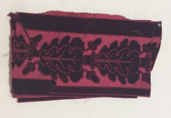 Eléments de bordure pour sièges et talons de la bordure de tenture : lot de quatre pièces de tailles et de section diverses, cousues ensemble à un angle. Deux d'entre elles présentent une lisière. Velours ciselé et frisé avec des réserves pour être rebrodé en or relevé sur fond satin pourpre n°1. Le dessin représente un courant de feuilles et fruits de chêne (largeur motif : 6,1 mm).