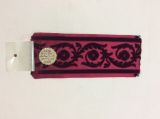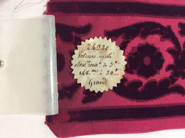 Elément de bordure de sièges et ployants. Pièce de section rectangulaire. Velours ciselé et frisé sur fond satin pourpre n°1. Décor en frise de rinceaux de feuilles d'acanthes, de palmes et de rosaces, entre deux bandes de velours.
