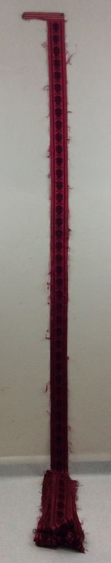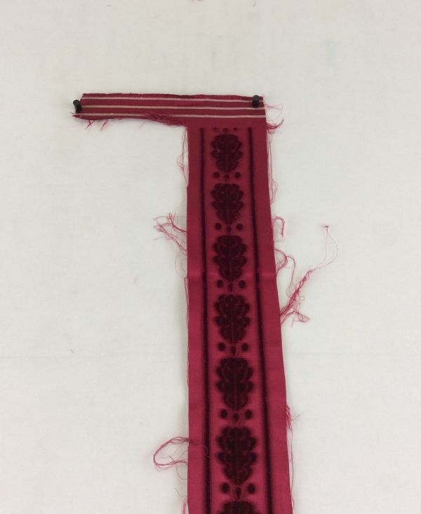 Elément de bordures pour écrans et paravents. Pièce de section rectangulaire. A l'une des extrémités le début du tissage du motif est visible, marqué par trois liserés blancs. La découpe est plus largeque la largeur de la frise à cette extrémité. Velours ciselé et frisé avec des réserves pour être rebrodé en or relevé sur fond satin pourpre n°1, dessin à courant de feuilles et fruits de chêne, entre deux bandes de velours.