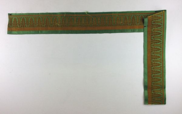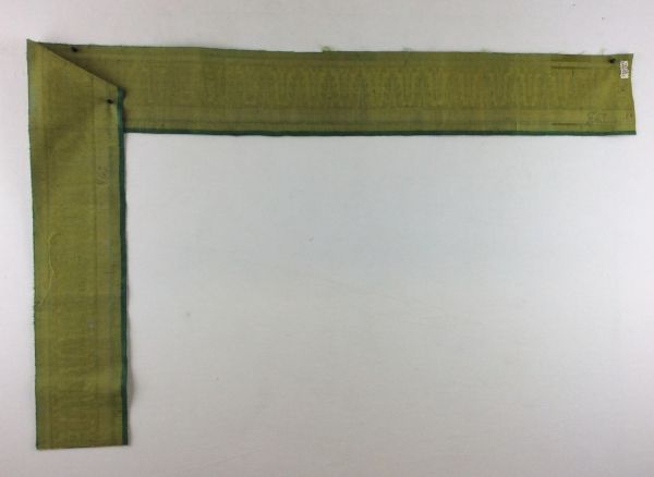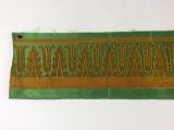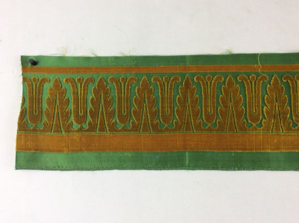 Dépècement de bordure de sièges. Le bord inférieur présente une lisière. Soie, velours ciselé coupé, jaune n°2, fond satin vert bleu n°3. Décor en frise de culots et de feuillages, encadrée de deux bandes : l'une plus large en-dessous et l'autre plus étroite au-dessus.
