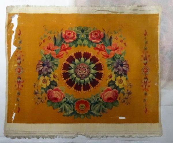 Ces étoffes sont représentatives du procédé élaboré par Gaspard Grégoire à la fin du XVIIIe siècle, pour la fabrication de tableaux et portraits en velours de soie coupé et peint sur chaîne. Les dimensions des laizes, contraintes par la technique, ne dépassent pas 40 à 50 cm de côté. D'après le livre d'inventaire, le meuble GMMP 773 serait sans doute issu d'un procédé d'impression sur velours plutôt que de peinture à proprement parler.