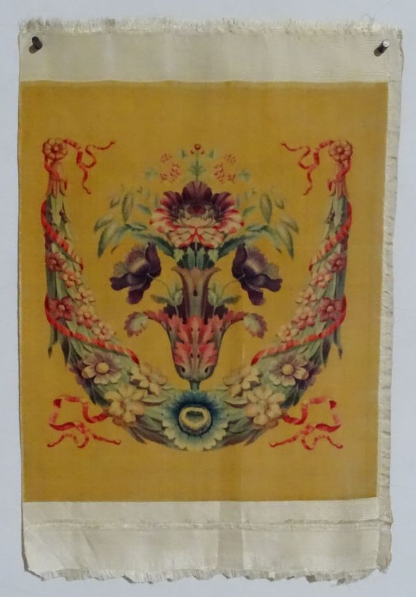 Dossier de siège, sans doute chaise, en velours de soie à fond chamois. Le dessin représente un bouquet de fleurs colorées se déployant depuis un culot de feuilles d'acanthe roses, émergeant d'une guirlande de lauriers et fleurs enrubannée et terminée par deux fleurettes.