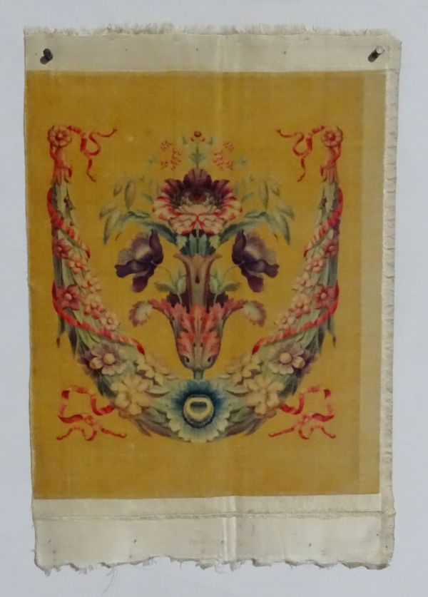 Dossier de siège, sans doute chaise, en velours de soie à fond chamois. Le dessin représente un bouquet de fleurs colorées se déployant depuis un culot de feuilles d'acanthe roses, émergeant d'une guirlande de lauriers et fleurs enrubannée et terminée par deux fleurettes.