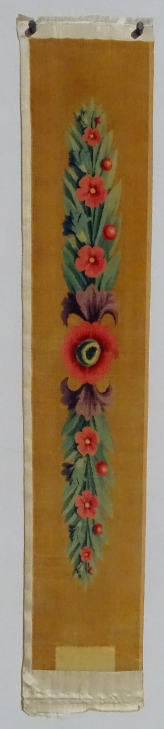 Plate-bande en velours de soie à fond chamois. Le dessin représente une fleur centrale avec deux fleurs violettes dont partent deux gurilandes de feuilles de laurier avec trois fleurettes et des baies sur chacune (en ligne droite).