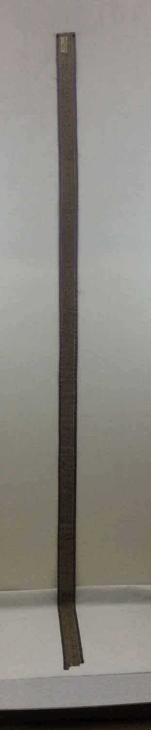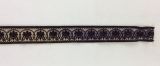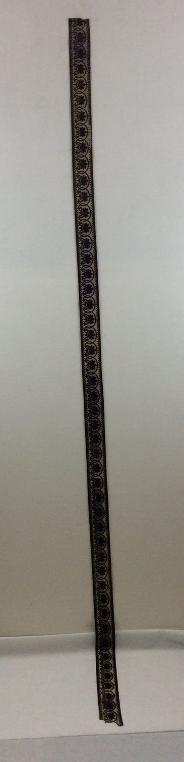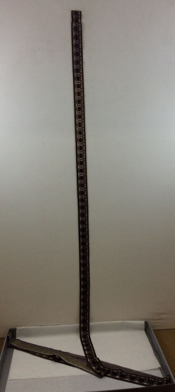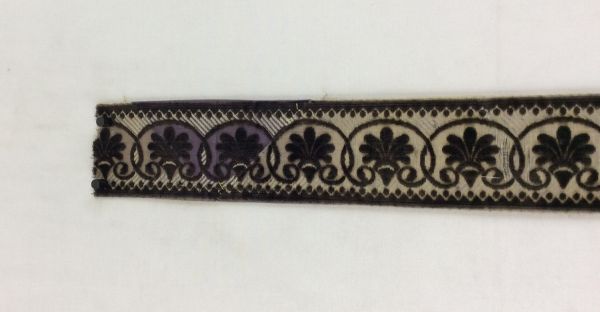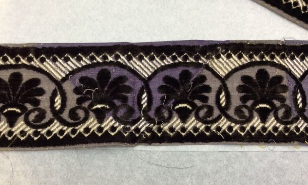 Echantillons de bordure. Section rectangulaire. Les bords latéraux sont repliés au revers et partiellement cousus. Velours de soie noir fond satin lilas liseré blanc, dessin à palmettes. Largeur du motif : 54 mm.