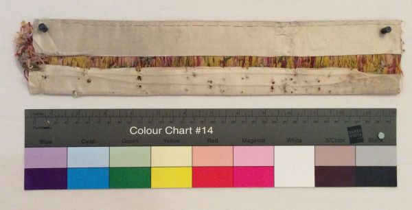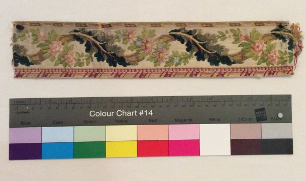 Elément de bordure de section rectangulaire. Lampas broché fond satin de 8. Soie et soie chenille. Frise de feuilles de chêne et fleurs colorées entrelacées, encadrée par des cordons perlés et enrubannés.
