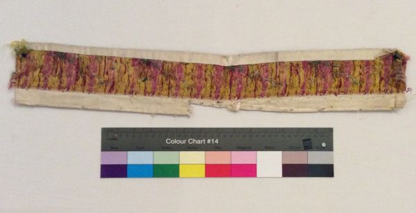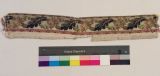 Elément de bordure de section rectangulaire, aux bords irréguliers. Lampas broché fond satin de 8. Soie et soie chenille. Frise de feuilles de chêne et fleurs colorées entrelacées, encadrée par des cordons perlés et enrubannés.