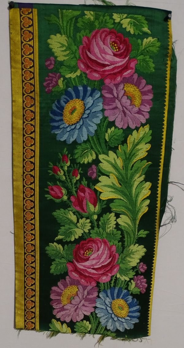 Bordure pour tenture. Damas fond satin vert bleu n°4 brochée soie nuée, dessin courant de roses, marguerites et feuilles en couleurs naturelles, talon, suite d’ornements liseré deux ors sur fond satin violet.