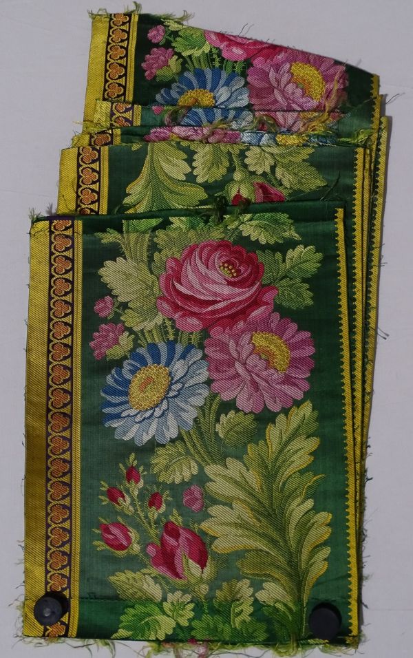 Bordure pour tenture. Damas fond satin vert bleu n°4 brochée soie nuée, dessin courant de roses, marguerites et feuilles en couleurs naturelles, talon, suite d’ornements liseré deux ors sur fond satin violet.
