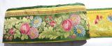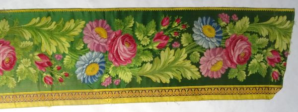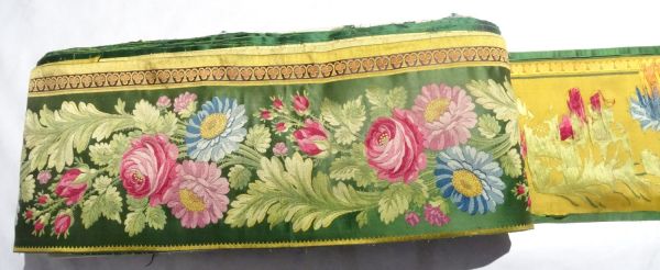 Tasseau de multiples bordures pour tenture. Satin vert bleu n° 4 broché soie, le dessin représente «un courant de roses, Marguerites et feuilles en Couleurs naturelles», talon, suite d’ornements liseré deux ors sur fond satin violet.