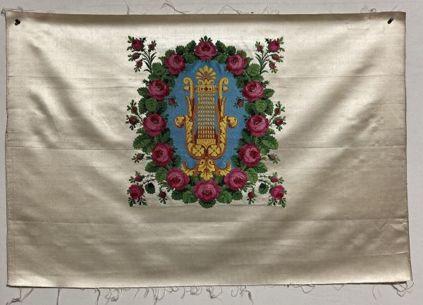 Dossier de chaise. Satin blanc broché soie nuée : lyre sur fond bleu dans un médaillon formé par une couronne de roses. Etat neuf.
