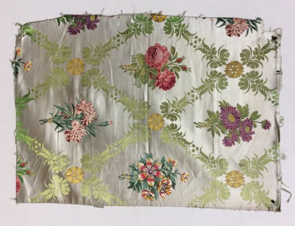 Satin fond blanc broché soie et nuée de diverses couleurs : des motifs végétaux géométrisés forment une trame de losanges au sein desquels s'épanouissent des bouquets de fleurs aux essences variées (dépécement).