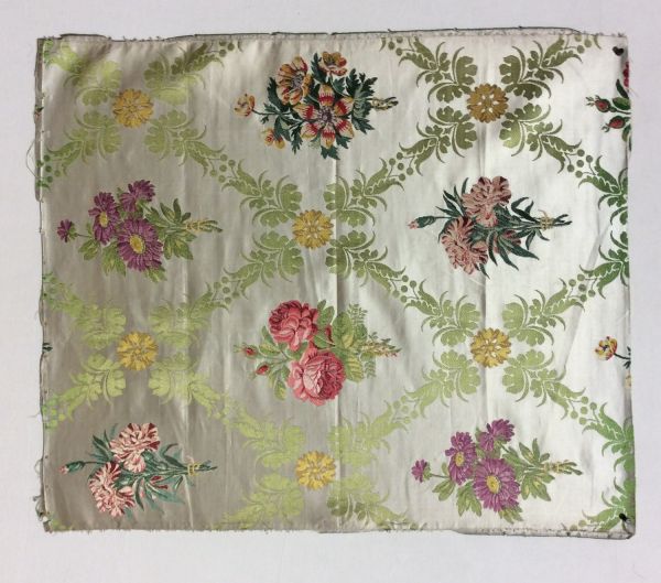 Satin fond blanc broché soie et nuée de diverses couleurs : des motifs végétaux géométrisés forment une trame de losanges au sein desquels s'épanouissent des bouquets de fleurs aux essences variées (dépécement).