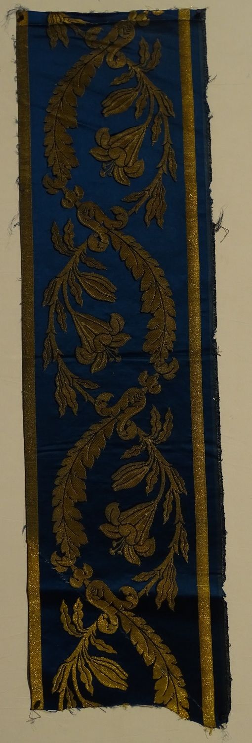 - Bordure brocart or fond satin bleu, dessin de branches et fleurs de lys.