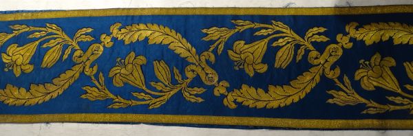 - Bordure en brocart or à fond satin bleu, dessins de branches et fleurs de lys.
