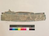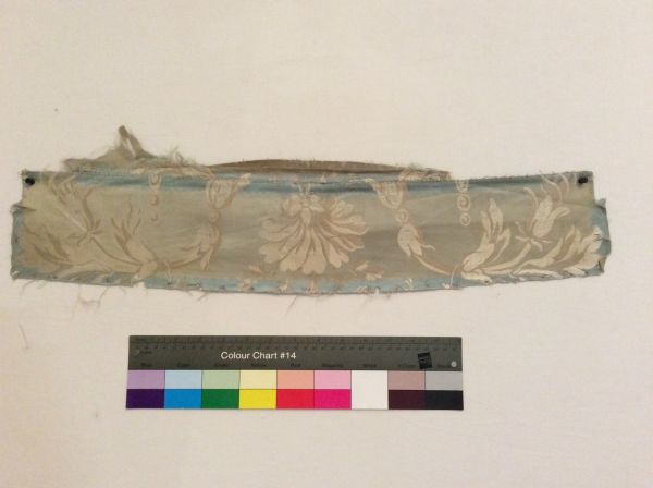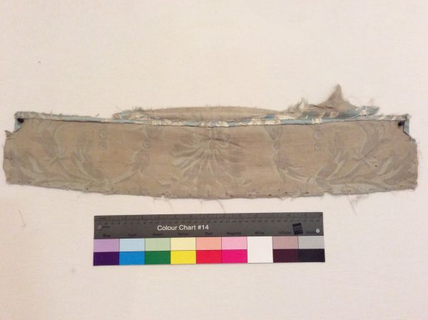 Dépècement de siège, petite bande de section rectangulaire composée de deux morceaux cousus ensemble. Lampas, fond satin. Fond bleu et décor blanc avec ornements décoratifs et fleurs de lys au naturel. L’échantillon découpé est à rapprocher des pièces GMMP 961-021 à GMMP 961-030.