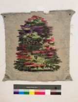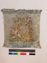 Dépècement de siège de section carrée, aux angles amincis. Les traces de galons sont encore visibles le long des bords inférieur et supérieur. Lampas broché, fond satin. Décor à fond bleu et blanc avec pampres de vignes au naturel. Composition centrale représentant des ruines d'une architecture en arcades, devant une composition florale avec fleurs de lilas et tulipes au naturel, avoisinées par deux colombes.