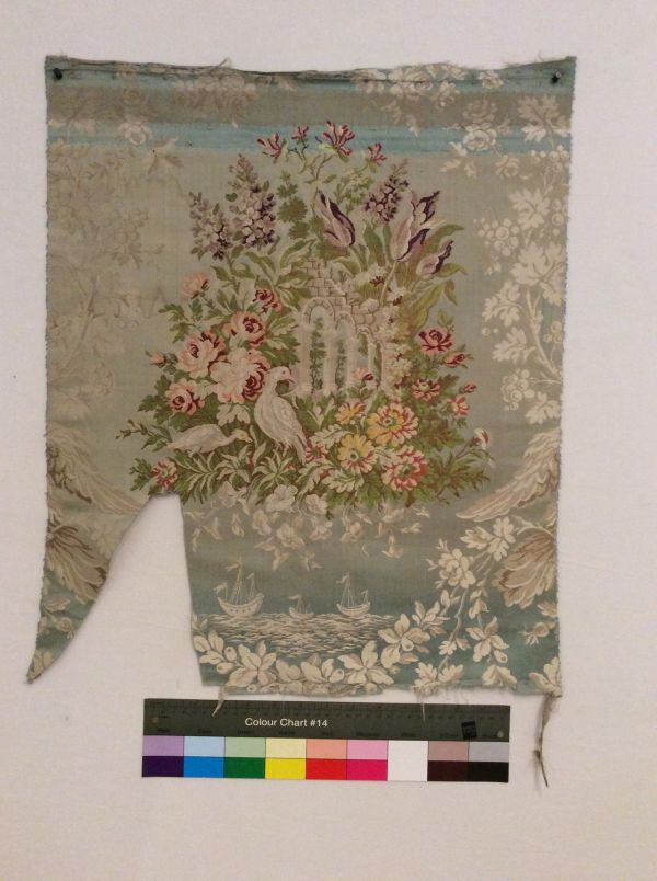 Dépècement de siège de section rectangulaire, présentant une lacune importante (en forme de triangle) près de l’angle inférieur gauche. Lampas broché, fond satin. Décor à fond bleu et blanc avec pampres de vignes au naturel. Composition centrale représentant des ruines d'une architecture en arcades, devant une composition florale avec fleurs de lilas et tulipes au naturel, avoisinées par deux colombes. Trois navires apparaissent sur les flots, dans la partie inférieure de la composition.