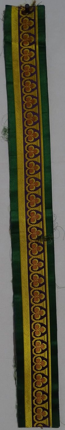 Bordure pour sièges. Trois couleurs fond satin violet, broché, liseré 2 ors, le dessin représente des feuilles trilobées.