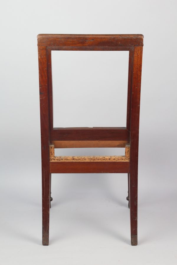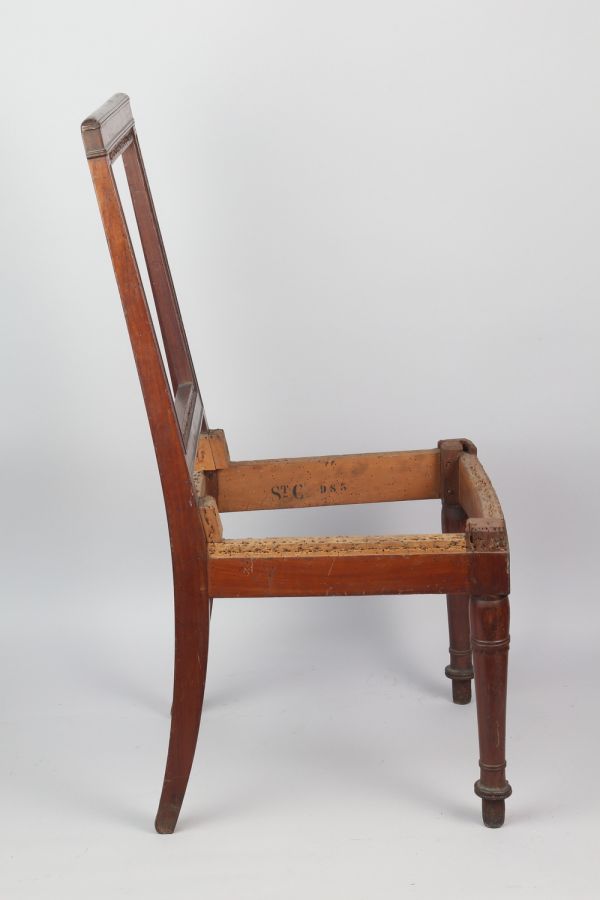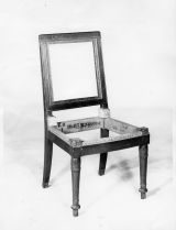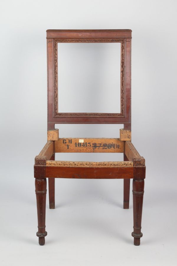 Retournée au Garde-meuble, le 9 novembre 1865, dans une paire, par le palais de Compiègne (Arch. Mob. nat., M241, f° 192 v°, n° 37280). L'une des deux chaises est vendue par les Domaines en 1888.