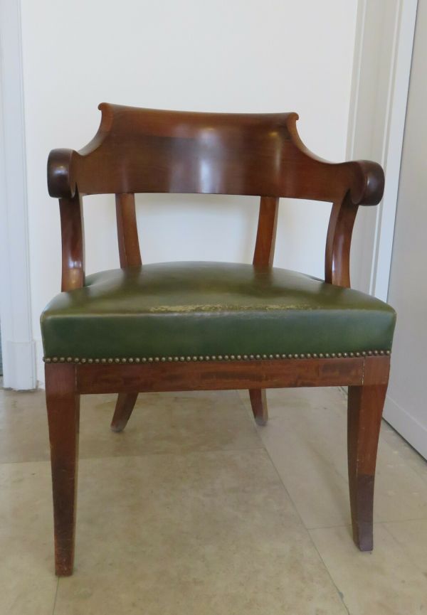 4 pieds sabre - Devanture droite - Dossier en large traverse en hémicycle à partie supérieure enroulée, prolongée en accotoirs dépassant les supports par un enroulement - Supports d'accotoirs excurvés - Siège à épaisseur.