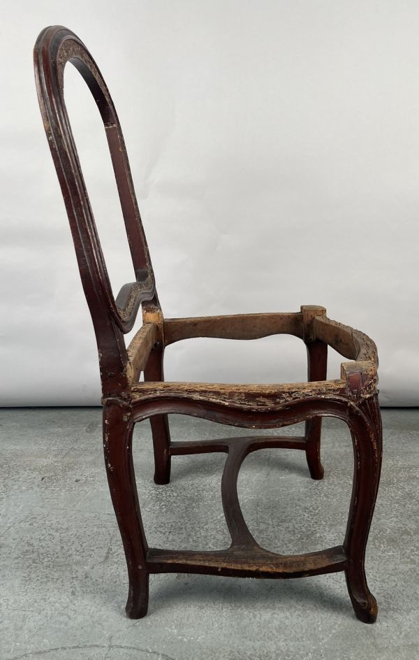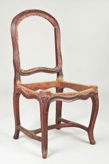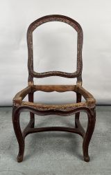 Ceinture chantournée et moulurée, côtés et devanture en doucine. Dossier dégagé, mouluré et chantourné en doucine, concave sur les côtés et dessous, et en arc raccordé aux montants au sommet.