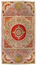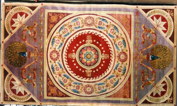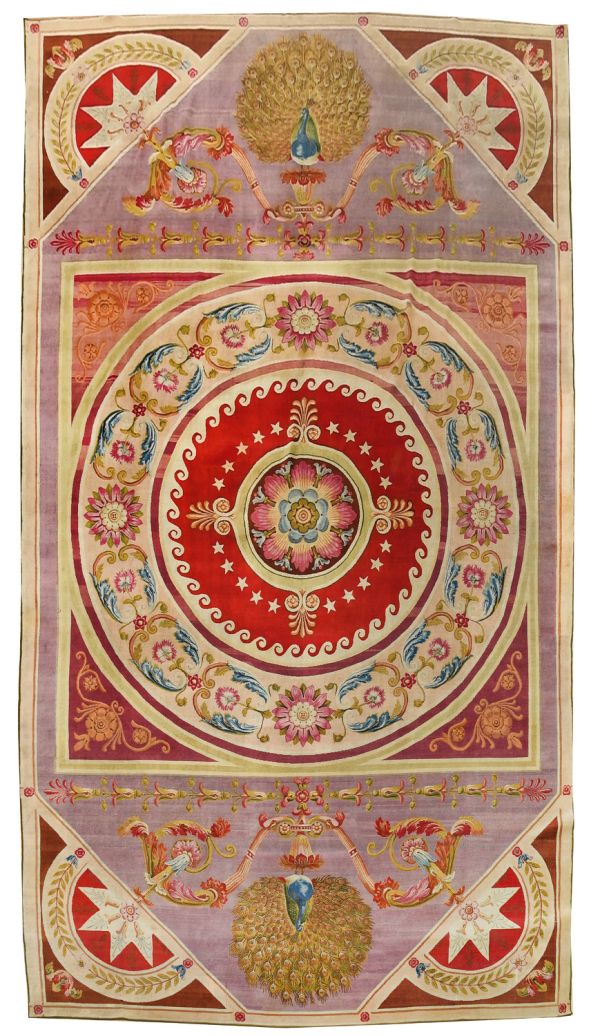 Tapis à grand caisson central, avec rosace encadrée de listels verts et blancs, de palmettes et d'étoiles sur fond rouge qu'entourent un cercle de postes et une large couronne de rosaces de fleurs et feuilles d'ornement circonscrite par deux listels lie de vin. En écoinçon décor d'ornements jaunes sur fond lie de vin. Aux deux extrémités, paon encadré de rinceaux. Aux quatre angles, un demi cercle meublé d'ornements. Le tout en coloris.