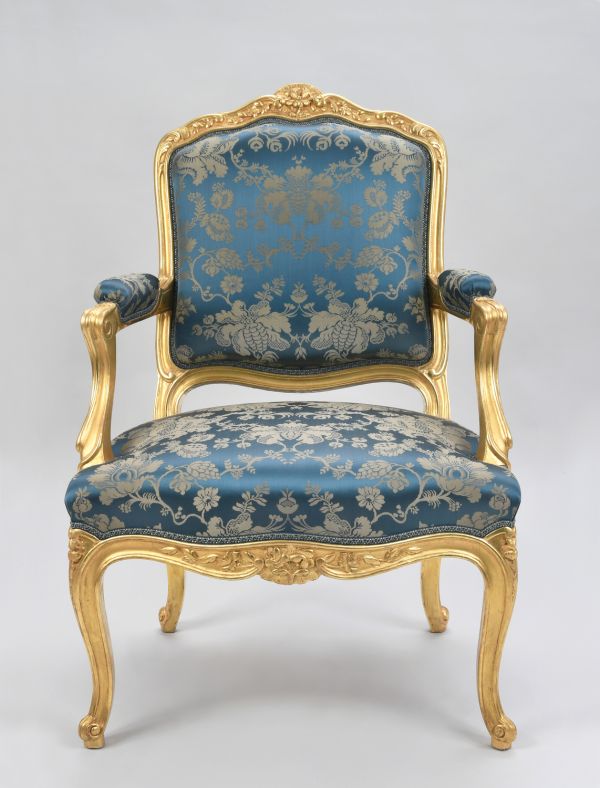 D'un ensemble de trente-six bois de fauteuils acheté le 8 août 1933 (état n° 13, feuille n° 11) : "36 bois de fauteuils hêtre doré, style de Louis XV, fabrication 1932. Pieds cambrés moulurés : les antérieurs ornés d'une fleurette ; les postérieurs montant en dossier. Traverses de ceinture moulurées : l'antérieure ornée de fleurettes et les latérales galbées ; la postérieure rectiligne. Dossiers à dévers, violoné, mouluré à traverses supérieures sculptées à décor de coquille et de fleurettes. Accotoirs à manchettes galbés en plan, moulurés se terminant au droit des supports. Supports d'accotoirs galbés, moulurés en retrait par rapport aux pieds" (Mob. nat., registre d'inventaire des meubles de menuiserie et d'ébénisterie, vol. 2, p. 283, GME 7214 ; registre M71, p. 72).