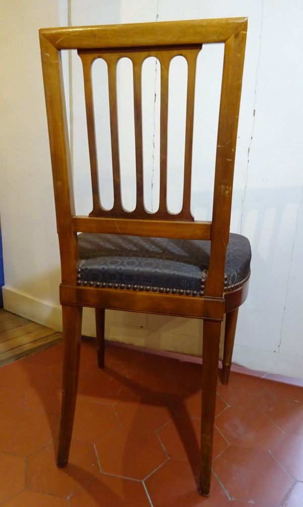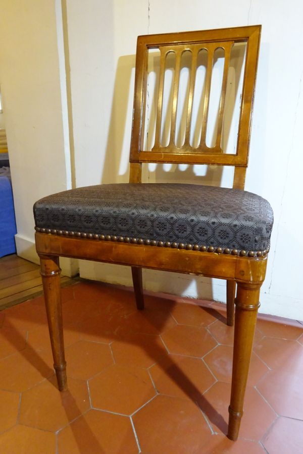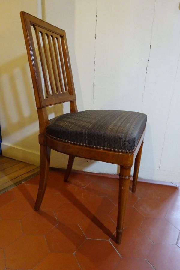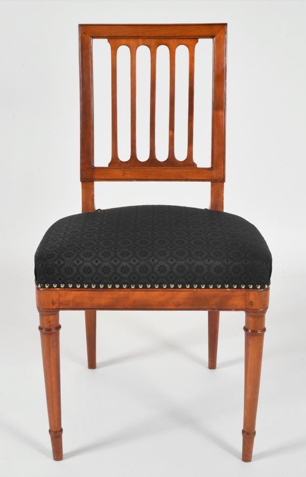 Pieds antérieurs tournés en gaine baguée. Pieds postérieurs sabre à chanfrein aux arêtes intérieures. Ceinture à côtés convexes arête inférieures arrondie nervée, la supérieure à congé, dés en coin rond. Dossier dégagé arêtes extérieures face arrondies nervées, les intérieures à congé, dos arrondi. Grille à 5 barres rectilignes, petit évasement concave aux 4 angles extérieurs. Siège à épaisseur sans ressort.